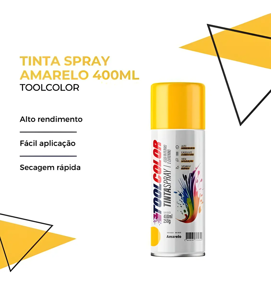 Tinta spray amarelo com alta cobertura e secagem rápida, ideal para pintura em diversas superfícies.