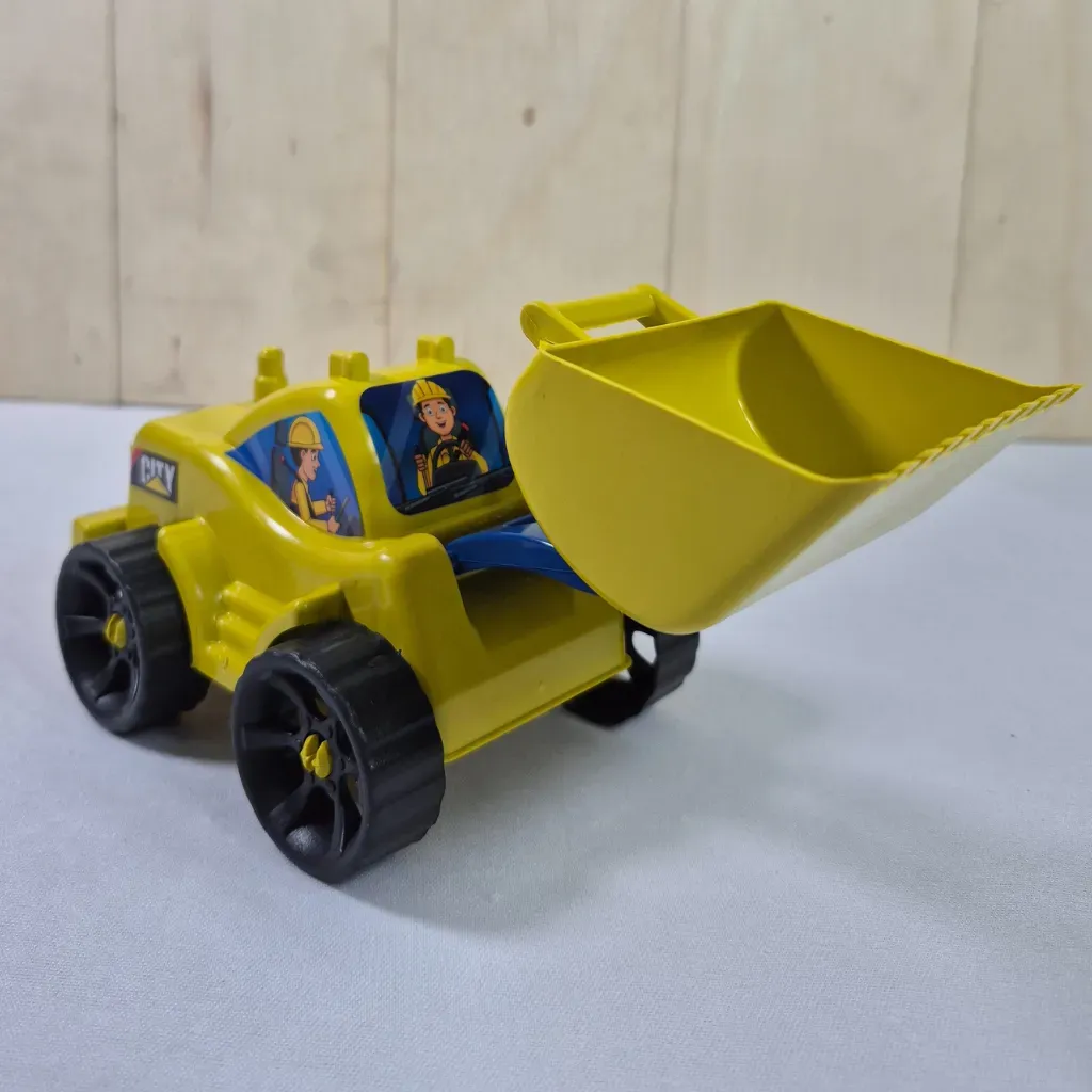 Trator pá carregadeira infantil em plástico resistente, ideal para brincadeiras de construção e aventuras cheias de imaginação.