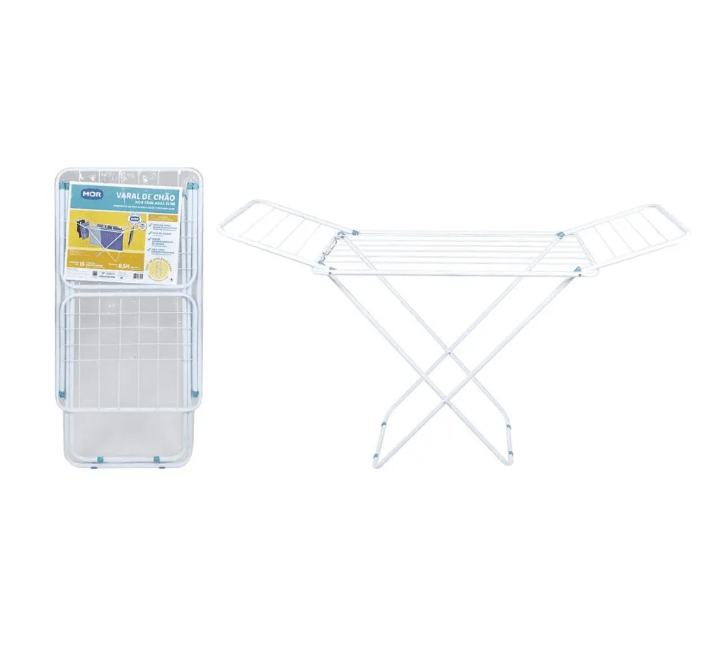 Varal de chão slim com abas dobráveis, compacto, resistente e ideal para secagem de roupas em ambientes internos e externos.