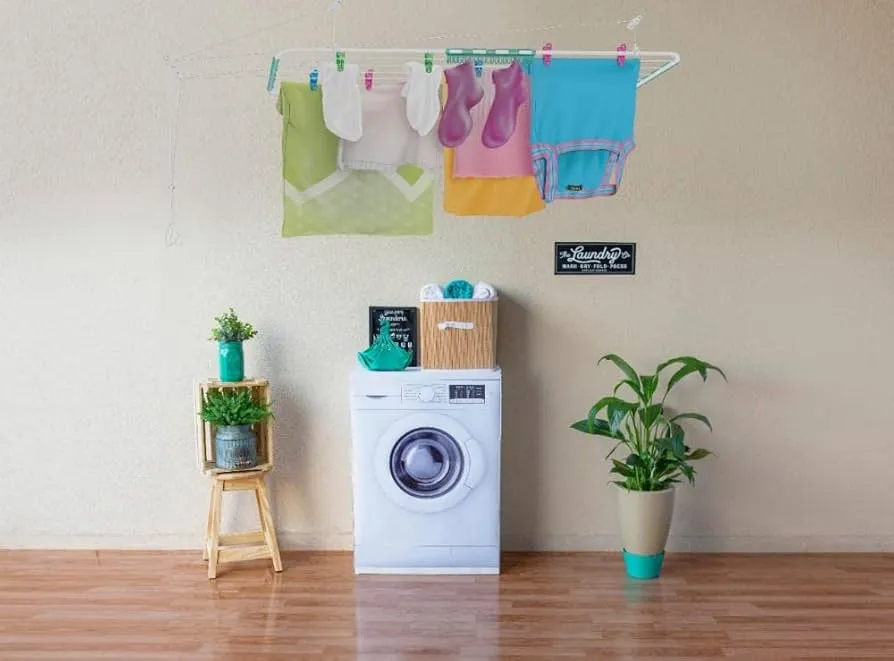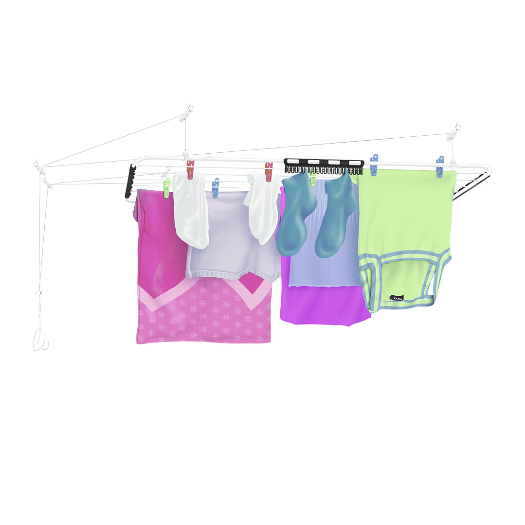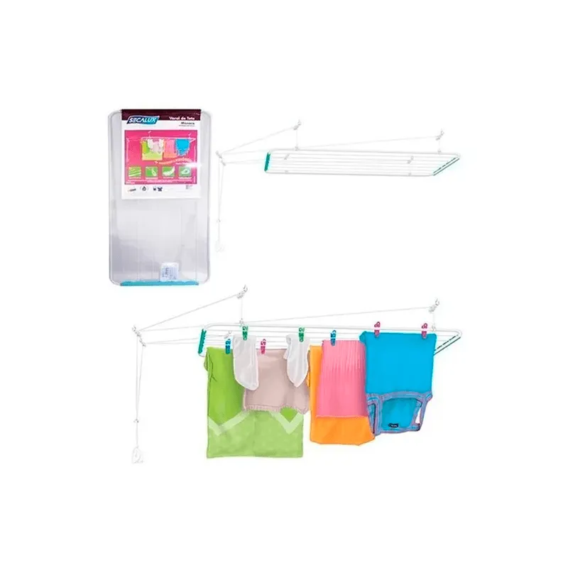 Varal pintado com tinta hibrida, epóxi com poliéster. Sistema de carretilha com roldana que facilita a ação de subir e descer o varal sem fazer muito esforço físico e evita o desgaste da corda. Braçadeiras reforçadas em plástico, para um acabamento estético mais sofisticado ao produto. Régua de proteção nas laterais do varal, para evitar arranhões ou desfiar a roupa. Vem com seca meias.