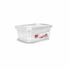 Caixa retangular transparente com tampa hermética e travas laterais que proporcionam vedação eficiente, mantendo os alimentos frescos por mais tempo.