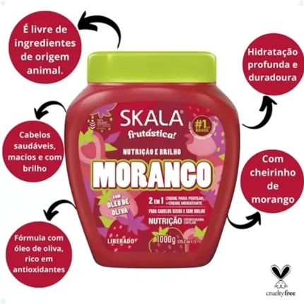 Creme de tratamento com extrato de morango, que revitaliza, hidrata e deixa os fios macios e perfumados.